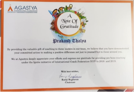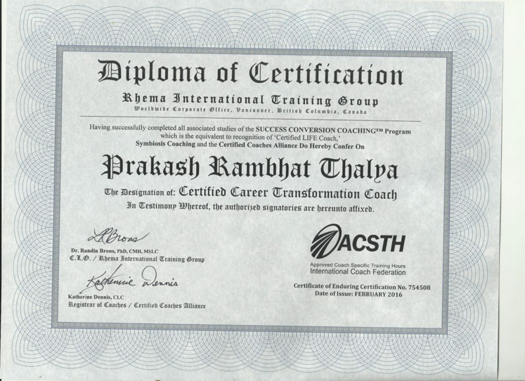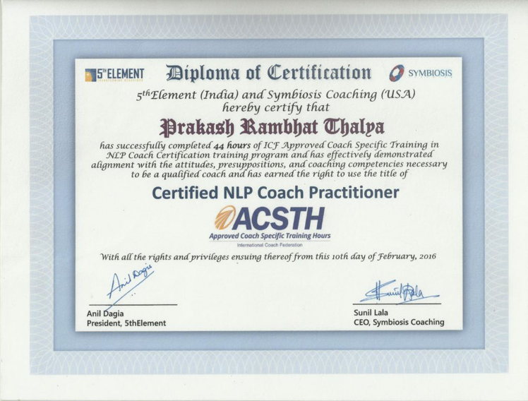 I have started my coaching journey by obtaining diploma in coaching from SYMBIOSIS COACHING, USA as a Certified Life Coach & Certified Career Transition Coach (ICF) (CCA). I am a holder of duel certification of NLP practitioner and coach and undergone more than 300 hours of class room training with an experience of coaching more than 750 executives since Feb 2016.